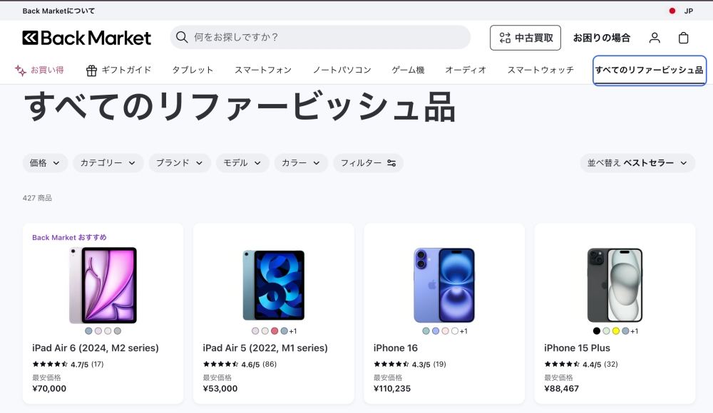 まずはバックマーケットの公式サイトで実際のラインナップを見てみてください。