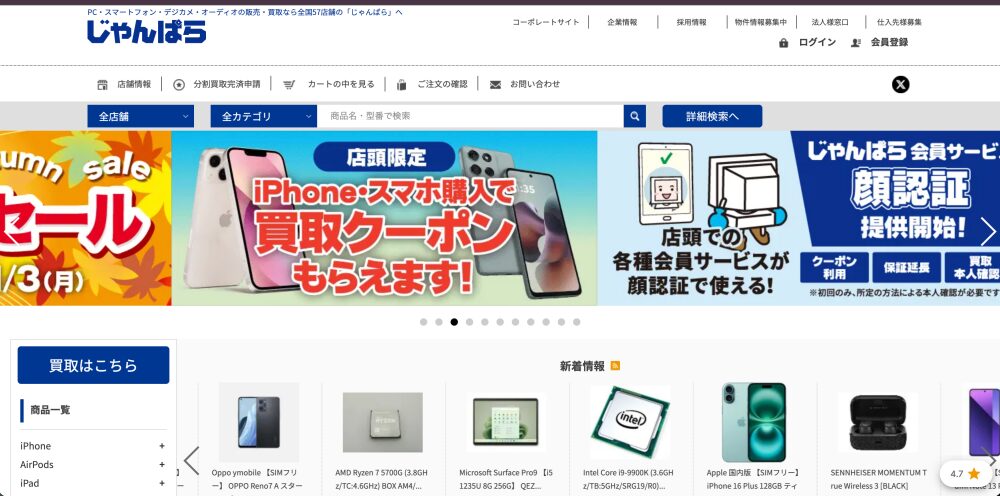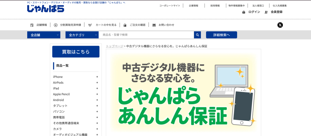 じゃんぱらは純粋な価格の安さで勝負しているショップです。同じ機種・同じランクでもイオシスより数千円安いことが多く、とにかく安く買いたい方にはおすすめです。