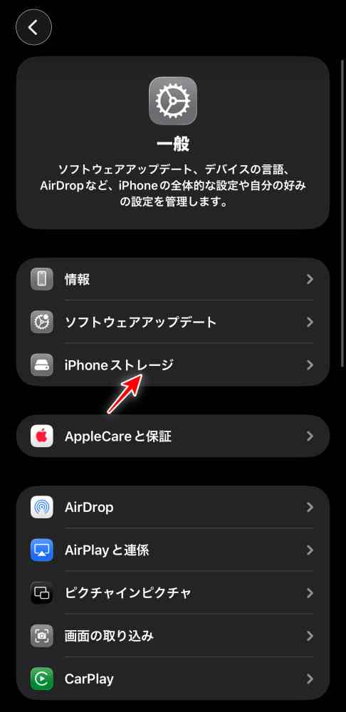 「設定」→「一般」→「iPhoneストレージ」を開くと、容量を圧迫しているアプリやデータが確認できます。