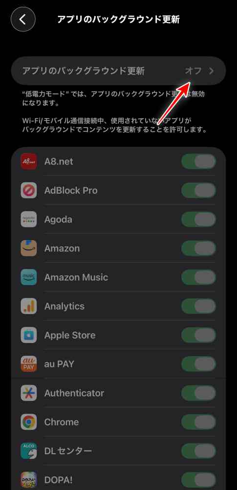 不要なアプリを停止またはバックグラウンド更新をオフにしておきましょう。