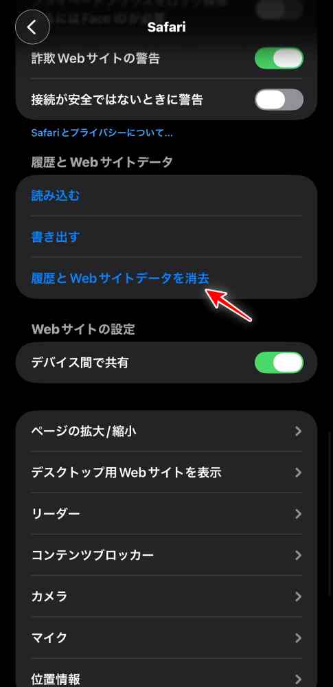 - 「設定」→「Safari」→「履歴とWebサイトデータを消去」