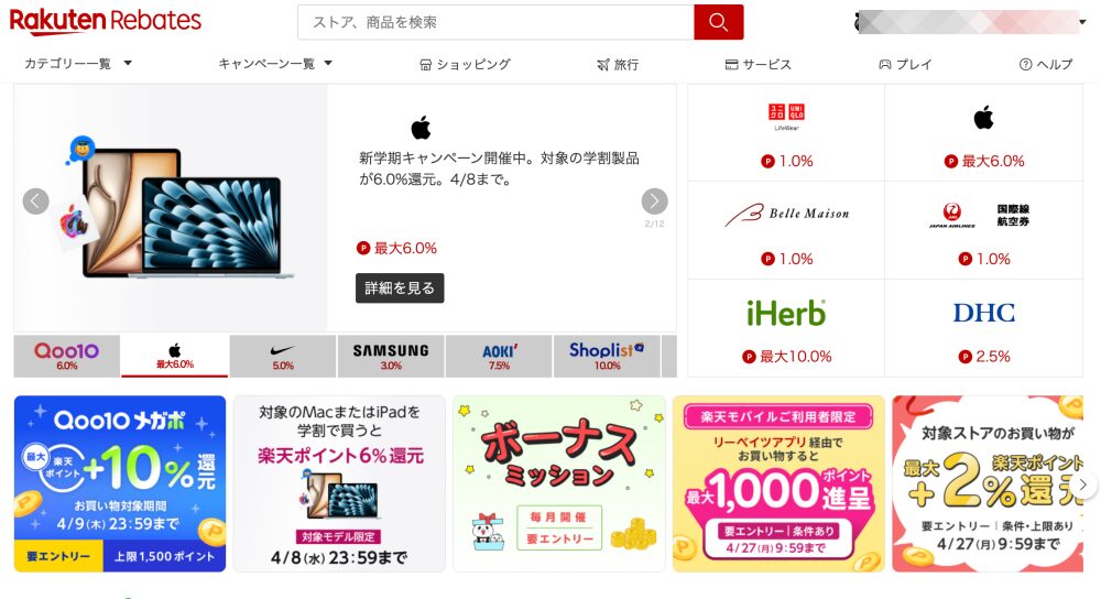 Apple公式ストアで購入する場合でも、リーベイツを経由するだけでポイント還元を受けられることがあります。